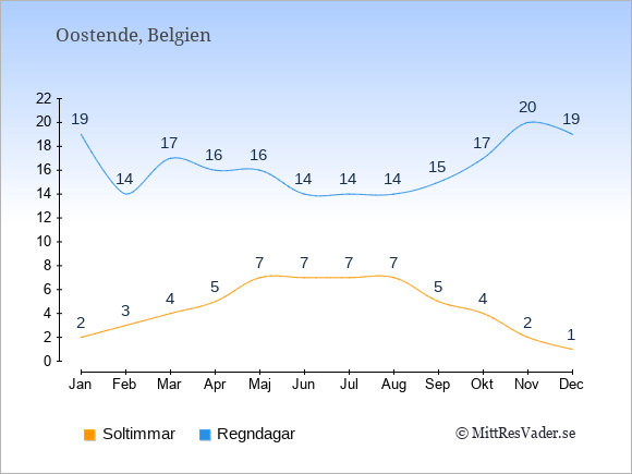 Graferna visar det genomsnittliga antalet soltimmar i Oostende per dag