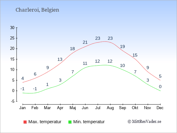 Grafen visar de genomsnittligt högsta temperaturerna i Charleroi (vanligtvis det värde som uppmätts mitt på dagen) och de genomsnittligt lägsta temperaturer (vanligtvis tidpunkten just innan soluppgång).