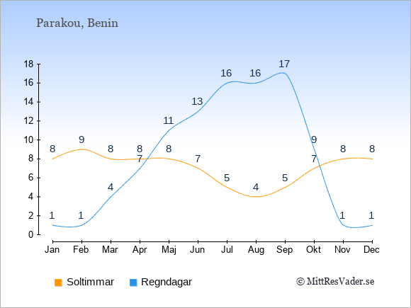 Grafen visar det genomsnittliga antalet soltimmar i Parakou under en viss månad (soltimmar är det antalet timmar per dag där solen skinnar), och antalet regndagar (dvs. det genomsnittliga antalet dagar