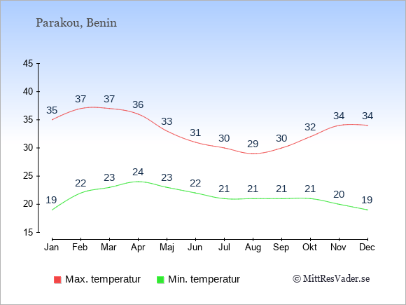 Grafen visar de genomsnittligt högsta temperaturerna i Parakou (vanligtvis det värde som uppmätts mitt på dagen) och de genomsnittligt lägsta temperaturer (vanligtvis tidpunkten just innan soluppgång).