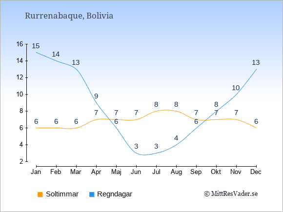 Graferna visar det genomsnittliga antalet soltimmar i Rurrenabaque per dag