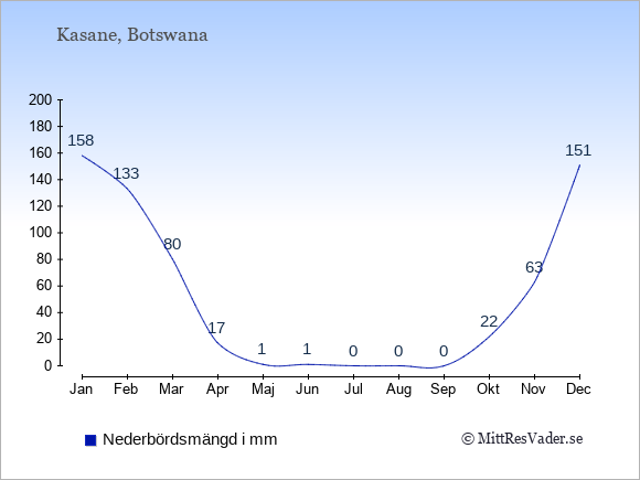 För att se hur vädret i Kasane skiljer sig från vädret hemma, kan du också jämföra siffrorna måned för måned med motsvarande siffror för Sverige under samma period här: Kasanes klimat.
