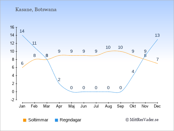 Grafen visar det genomsnittliga antalet soltimmar i Kasane under en viss månad (soltimmar är det antalet timmar per dag där solen skinnar), och antalet regndagar (dvs. det genomsnittliga antalet dagar