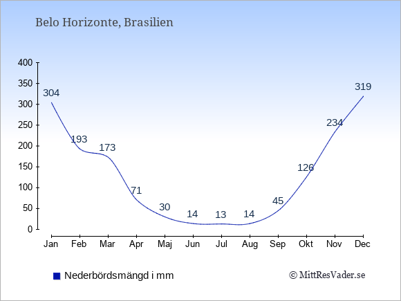 För att se hur vädret i Belo Horizonte skiljer sig från vädret hemma, kan du också jämföra siffrorna måned för måned med motsvarande siffror för Sverige under samma period här: Belo Horizontes klimat.