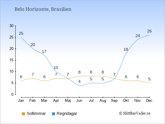 Grafen visar det genomsnittliga antalet soltimmar i Belo Horizonte under en viss månad (soltimmar är det antalet timmar per dag där solen skinnar), och antalet regndagar (dvs. det genomsnittliga antalet dagar