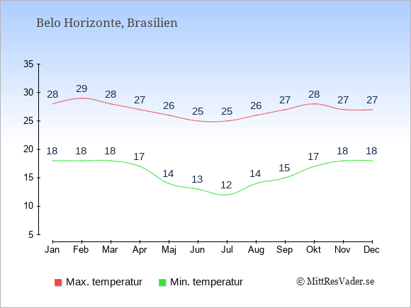 Grafen visar de genomsnittligt högsta temperaturerna i Belo Horizonte (vanligtvis det värde som uppmätts mitt på dagen) och de genomsnittligt lägsta temperaturer (vanligtvis tidpunkten just innan soluppgång).