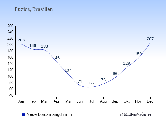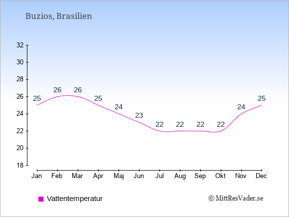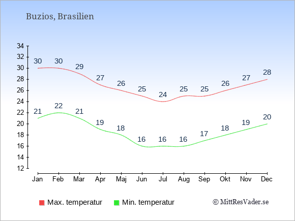 Grafen visar de genomsnittligt högsta temperaturerna i Buzios (vanligtvis det värde som uppmätts mitt på dagen) och de genomsnittligt lägsta temperaturer (vanligtvis tidpunkten just innan soluppgång).
