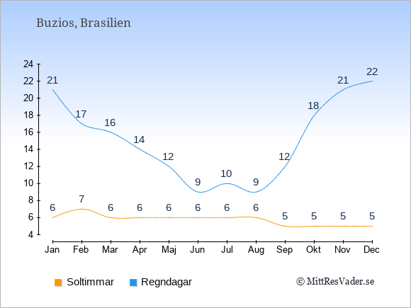 Grafen visar det genomsnittliga antalet soltimmar i Buzios under en viss månad (soltimmar är det antalet timmar per dag där solen skinnar), och antalet regndagar (dvs. det genomsnittliga antalet dagar