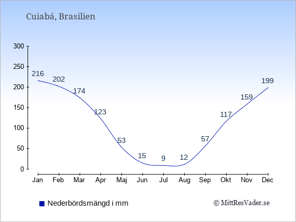 För att se hur vädret i Cuiabá skiljer sig från vädret hemma, kan du också jämföra siffrorna måned för måned med motsvarande siffror för Sverige under samma period här: Cuiabás klimat.