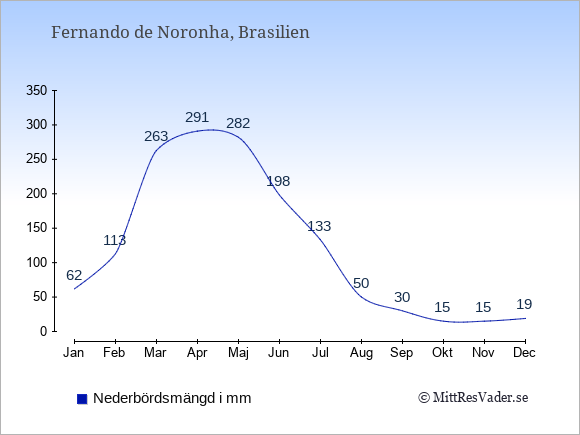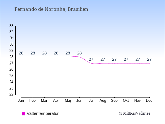 För att se hur vädret på Fernando de Noronha skiljer sig från vädret hemma, kan du också jämföra siffrorna måned för måned med motsvarande siffror för Sverige under samma period här: Fernando de Noronhas klimat.