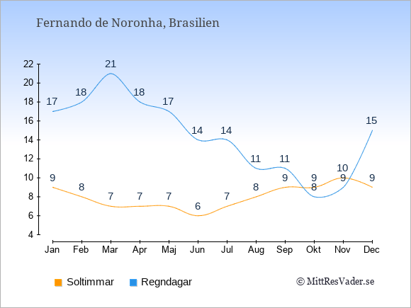 Grafen visar det genomsnittliga antalet soltimmar på Fernando de Noronha under en viss månad (soltimmar är det antalet timmar per dag där solen skinnar), och antalet regndagar (dvs. det genomsnittliga antalet dagar