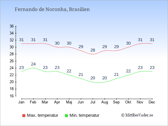Grafen visar de genomsnittligt högsta temperaturerna på Fernando de Noronha (vanligtvis det värde som uppmätts mitt på dagen) och de genomsnittligt lägsta temperaturer (vanligtvis tidpunkten just innan soluppgång).