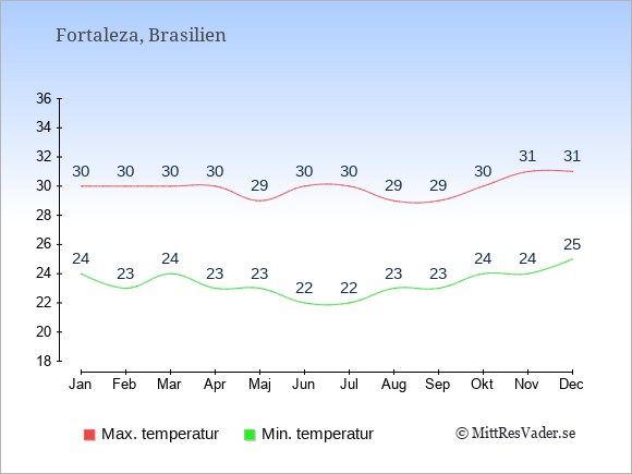 Grafen visar de genomsnittligt högsta temperaturerna i Fortaleza (vanligtvis det värde som uppmätts mitt på dagen) och de genomsnittligt lägsta temperaturer (vanligtvis tidpunkten just innan soluppgång).