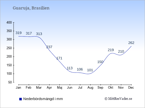 För att se hur vädret i Guaruja skiljer sig från vädret hemma, kan du också jämföra siffrorna måned för måned med motsvarande siffror för Sverige under samma period här: Guarujas klimat.