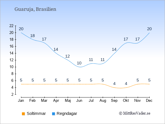 Grafen visar det genomsnittliga antalet soltimmar i Guaruja under en viss månad (soltimmar är det antalet timmar per dag där solen skinnar), och antalet regndagar (dvs. det genomsnittliga antalet dagar