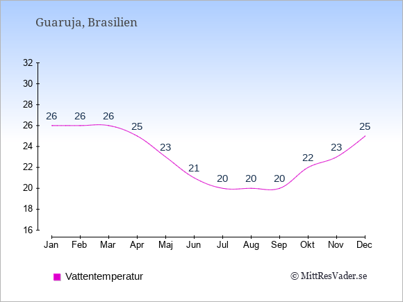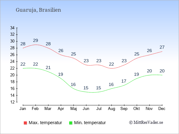 Grafen visar de genomsnittligt högsta temperaturerna i Guaruja (vanligtvis det värde som uppmätts mitt på dagen) och de genomsnittligt lägsta temperaturer (vanligtvis tidpunkten just innan soluppgång).