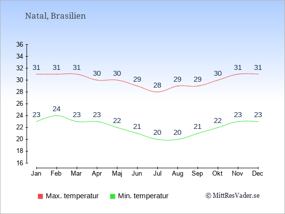 Grafen visar de genomsnittligt högsta temperaturerna i Natal (vanligtvis det värde som uppmätts mitt på dagen) och de genomsnittligt lägsta temperaturer (vanligtvis tidpunkten just innan soluppgång).