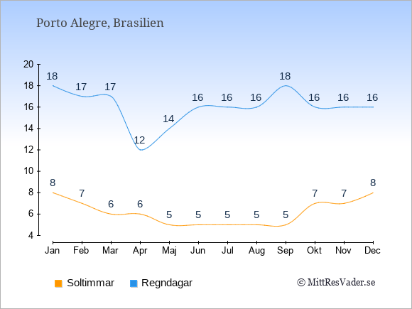 Grafen visar det genomsnittliga antalet soltimmar i Porto Alegre under en viss månad (soltimmar är det antalet timmar per dag där solen skinnar), och antalet regndagar (dvs. det genomsnittliga antalet dagar
