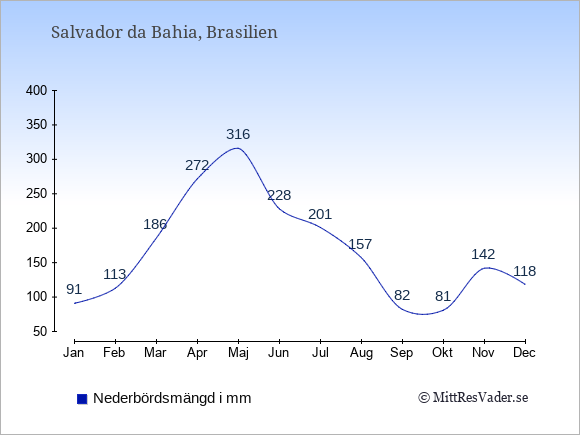 För att se hur vädret i Salvador da Bahia skiljer sig från vädret hemma, kan du också jämföra siffrorna måned för måned med motsvarande siffror för Sverige under samma period här: Salvador da Bahias klimat.