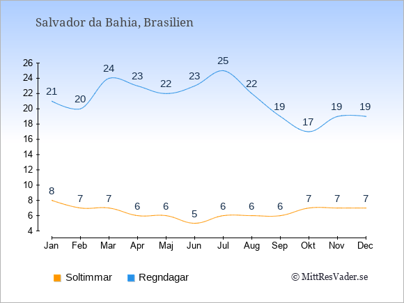 Grafen visar det genomsnittliga antalet soltimmar i Salvador da Bahia under en viss månad (soltimmar är det antalet timmar per dag där solen skinnar), och antalet regndagar (dvs. det genomsnittliga antalet dagar