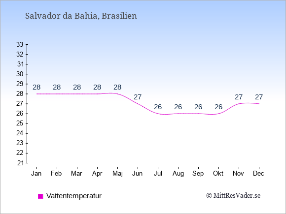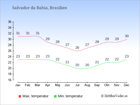 Grafen visar de genomsnittligt högsta temperaturerna i Salvador da Bahia (vanligtvis det värde som uppmätts mitt på dagen) och de genomsnittligt lägsta temperaturer (vanligtvis tidpunkten just innan soluppgång).