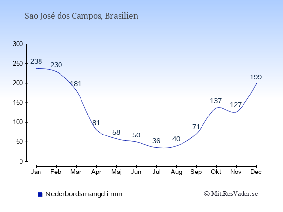 För att se hur vädret i Sao José dos Campos skiljer sig från vädret hemma, kan du också jämföra siffrorna måned för måned med motsvarande siffror för Sverige under samma period här: Sao José dos Campos klimat.