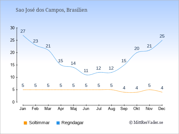 Väder i Sao José dos Campos: Soltimmar och regndagar