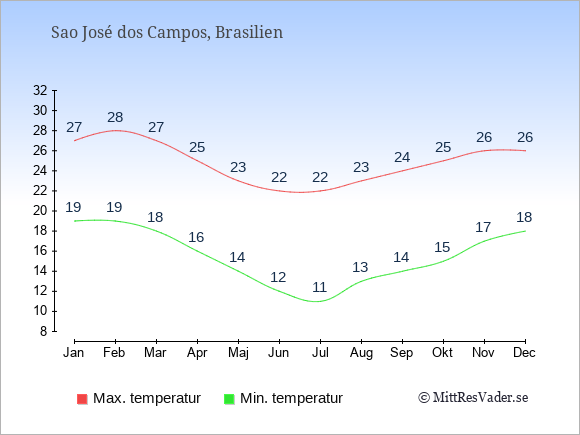 Grafen visar de genomsnittligt högsta temperaturerna i Sao José dos Campos (vanligtvis det värde som uppmätts mitt på dagen) och de genomsnittligt lägsta temperaturer (vanligtvis tidpunkten just innan soluppgång).