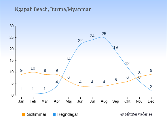Graferna visar det genomsnittliga antalet soltimmar i Ngapali Beach per dag