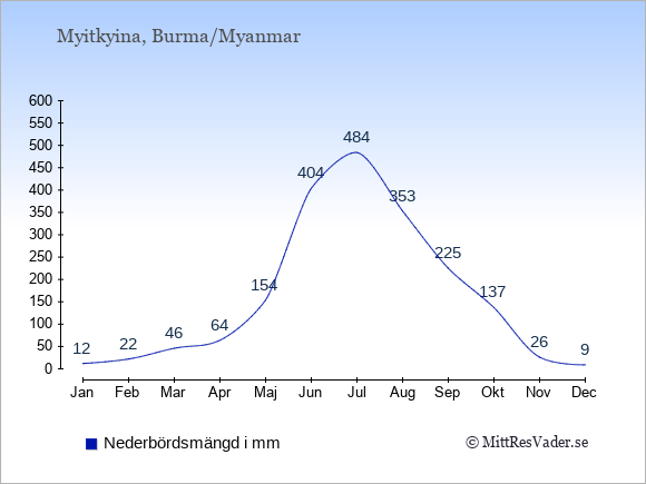 För att se hur vädret i Myitkyina skiljer sig från vädret hemma, kan du också jämföra siffrorna måned för måned med motsvarande siffror för Sverige under samma period här: Myitkyinas klimat.