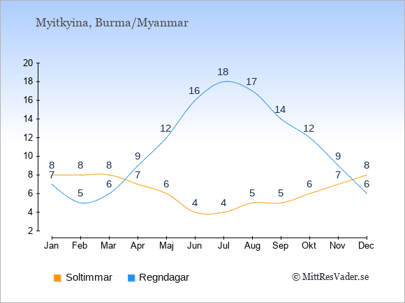 Grafen visar det genomsnittliga antalet soltimmar i Myitkyina under en viss månad (soltimmar är det antalet timmar per dag där solen skinnar), och antalet regndagar (dvs. det genomsnittliga antalet dagar