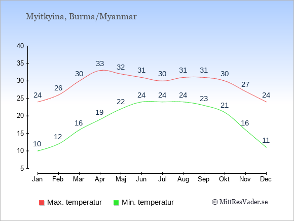 Grafen visar de genomsnittligt högsta temperaturerna i Myitkyina (vanligtvis det värde som uppmätts mitt på dagen) och de genomsnittligt lägsta temperaturer (vanligtvis tidpunkten just innan soluppgång).
