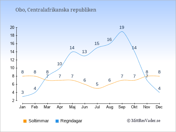 Grafen visar det genomsnittliga antalet soltimmar i Obo under en viss månad (soltimmar är det antalet timmar per dag där solen skinnar), och antalet regndagar (dvs. det genomsnittliga antalet dagar