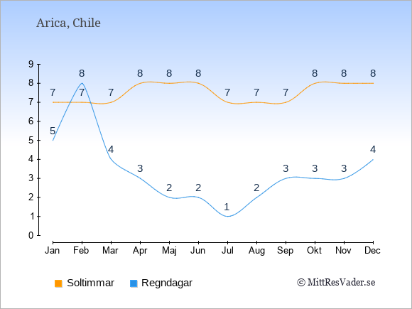 Grafen visar det genomsnittliga antalet soltimmar i Arica under en viss månad (soltimmar är det antalet timmar per dag där solen skinnar), och antalet regndagar (dvs. det genomsnittliga antalet dagar