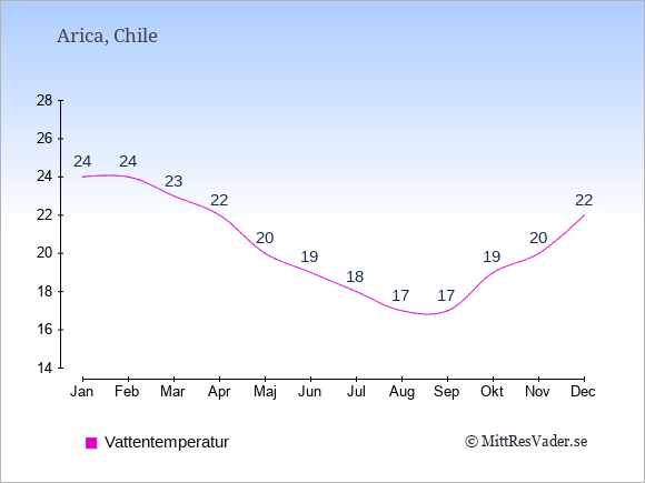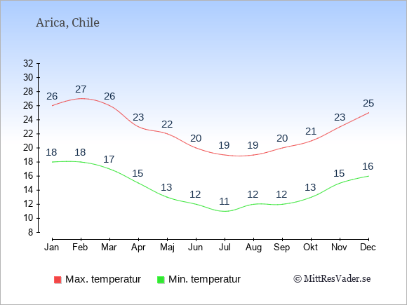 Grafen visar de genomsnittligt högsta temperaturerna i Arica (vanligtvis det värde som uppmätts mitt på dagen) och de genomsnittligt lägsta temperaturer (vanligtvis tidpunkten just innan soluppgång).