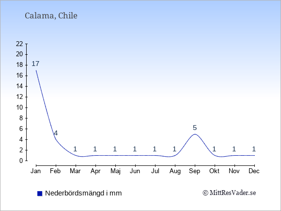 För att se hur vädret i Calama skiljer sig från vädret hemma, kan du också jämföra siffrorna måned för måned med motsvarande siffror för Sverige under samma period här: Calamas klimat.