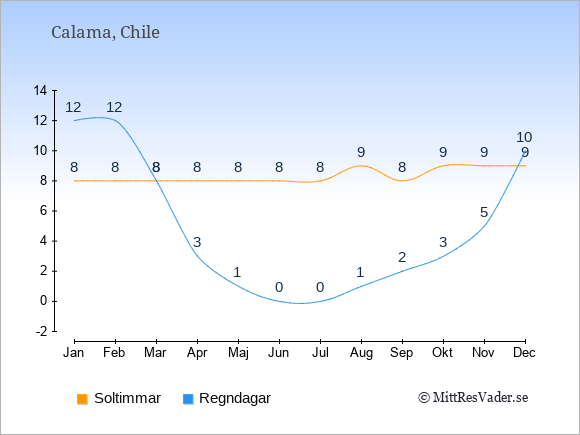 Grafen visar det genomsnittliga antalet soltimmar i Calama under en viss månad (soltimmar är det antalet timmar per dag där solen skinnar), och antalet regndagar (dvs. det genomsnittliga antalet dagar
