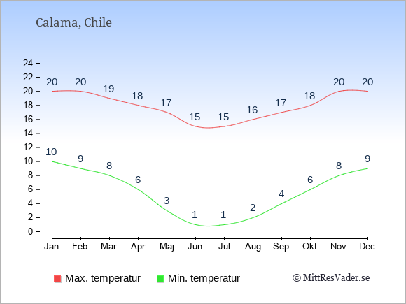 Grafen visar de genomsnittligt högsta temperaturerna i Calama (vanligtvis det värde som uppmätts mitt på dagen) och de genomsnittligt lägsta temperaturer (vanligtvis tidpunkten just innan soluppgång).
