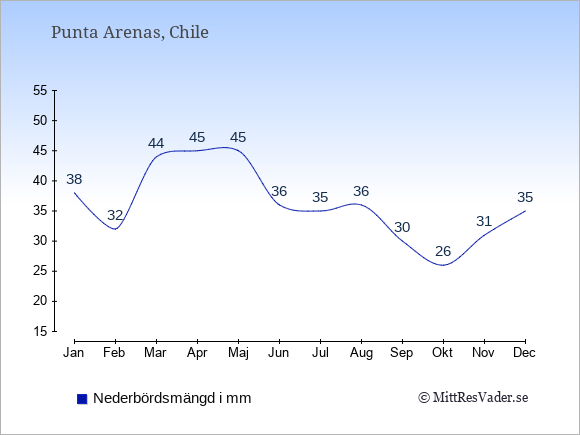 För att se hur vädret i Punta Arenas skiljer sig från vädret hemma, kan du också jämföra siffrorna måned för måned med motsvarande siffror för Sverige under samma period här: Punta Arenas klimat.