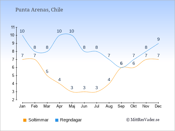 Grafen visar det genomsnittliga antalet soltimmar i Punta Arenas under en viss månad (soltimmar är det antalet timmar per dag där solen skinnar), och antalet regndagar (dvs. det genomsnittliga antalet dagar