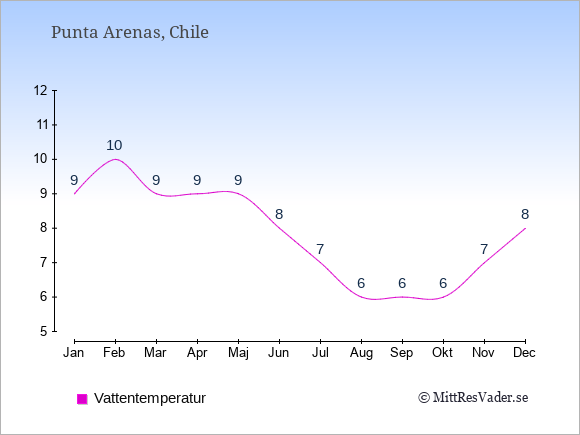 Få en överblick över vädret i Punta Arenas månad för månad med temperaturer, vattentemperatur, soltimmar och nederbörd.