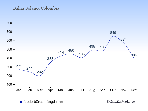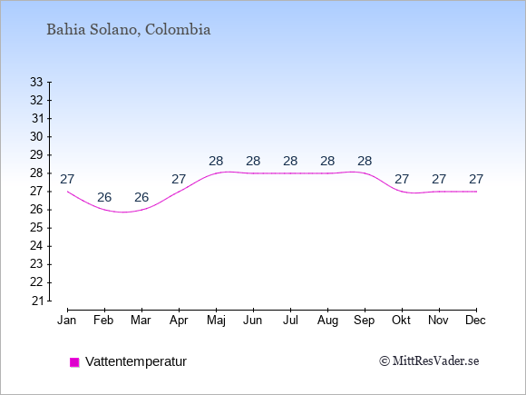 För att se hur vädret i Bahia Solano skiljer sig från vädret hemma, kan du också jämföra siffrorna måned för måned med motsvarande siffror för Sverige under samma period här: Bahia Solanos klimat.