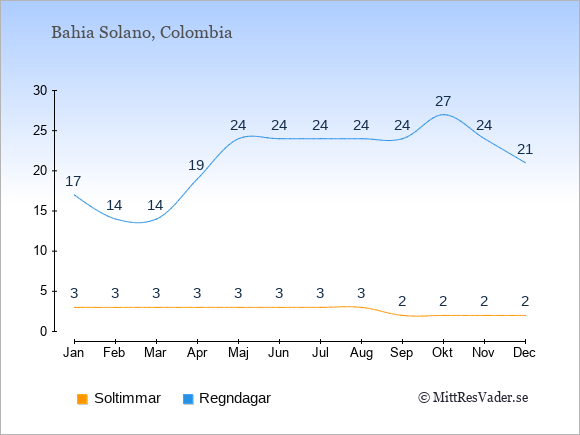 Grafen visar det genomsnittliga antalet soltimmar i Bahia Solano under en viss månad (soltimmar är det antalet timmar per dag där solen skinnar), och antalet regndagar (dvs. det genomsnittliga antalet dagar