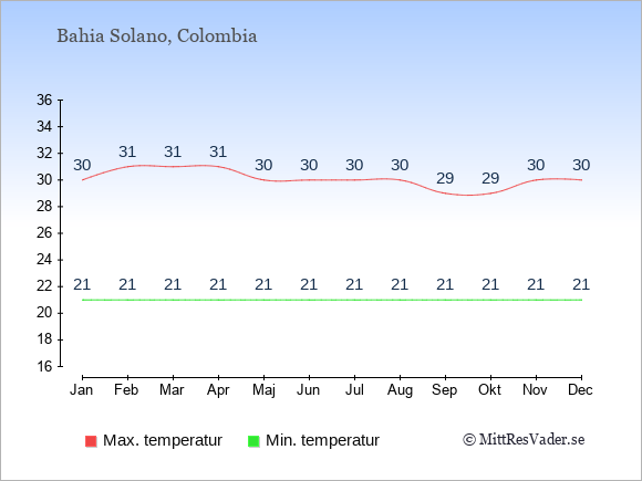 Grafen visar de genomsnittligt högsta temperaturerna i Bahia Solano (vanligtvis det värde som uppmätts mitt på dagen) och de genomsnittligt lägsta temperaturer (vanligtvis tidpunkten just innan soluppgång).