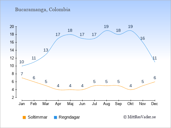 Grafen visar det genomsnittliga antalet soltimmar i Bucaramanga under en viss månad (soltimmar är det antalet timmar per dag där solen skinnar), och antalet regndagar (dvs. det genomsnittliga antalet dagar