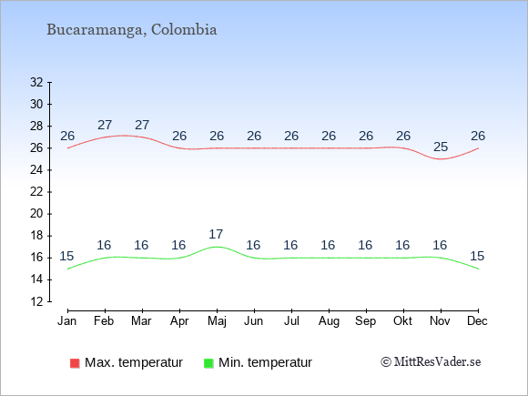 Grafen visar de genomsnittligt högsta temperaturerna i Bucaramanga (vanligtvis det värde som uppmätts mitt på dagen) och de genomsnittligt lägsta temperaturer (vanligtvis tidpunkten just innan soluppgång).