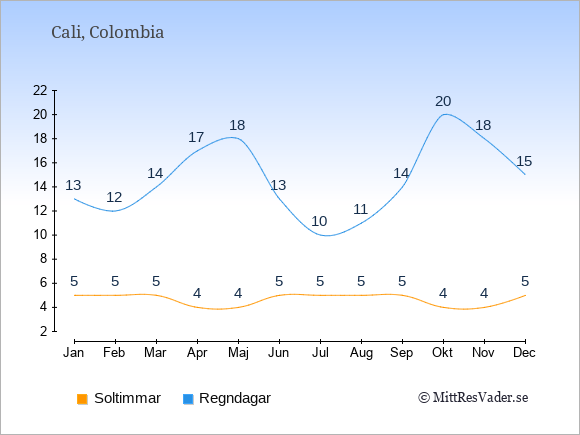 Grafen visar det genomsnittliga antalet soltimmar i Cali under en viss månad (soltimmar är det antalet timmar per dag där solen skinnar), och antalet regndagar (dvs. det genomsnittliga antalet dagar