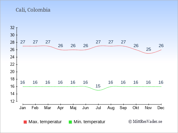 Grafen visar de genomsnittligt högsta temperaturerna i Cali (vanligtvis det värde som uppmätts mitt på dagen) och de genomsnittligt lägsta temperaturer (vanligtvis tidpunkten just innan soluppgång).