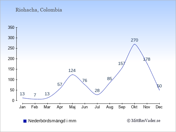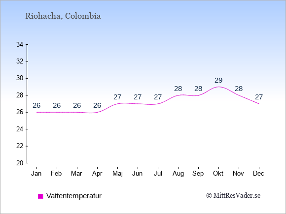 För att se hur vädret i Riohacha skiljer sig från vädret hemma, kan du också jämföra siffrorna måned för måned med motsvarande siffror för Sverige under samma period här: Riohachas klimat.