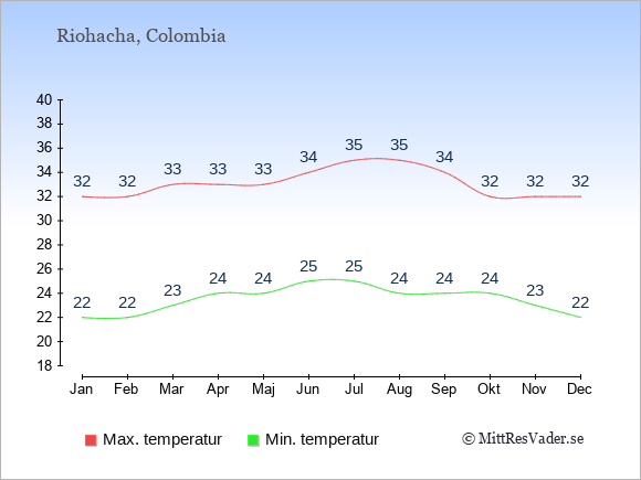 Grafen visar de genomsnittligt högsta temperaturerna i Riohacha (vanligtvis det värde som uppmätts mitt på dagen) och de genomsnittligt lägsta temperaturer (vanligtvis tidpunkten just innan soluppgång).